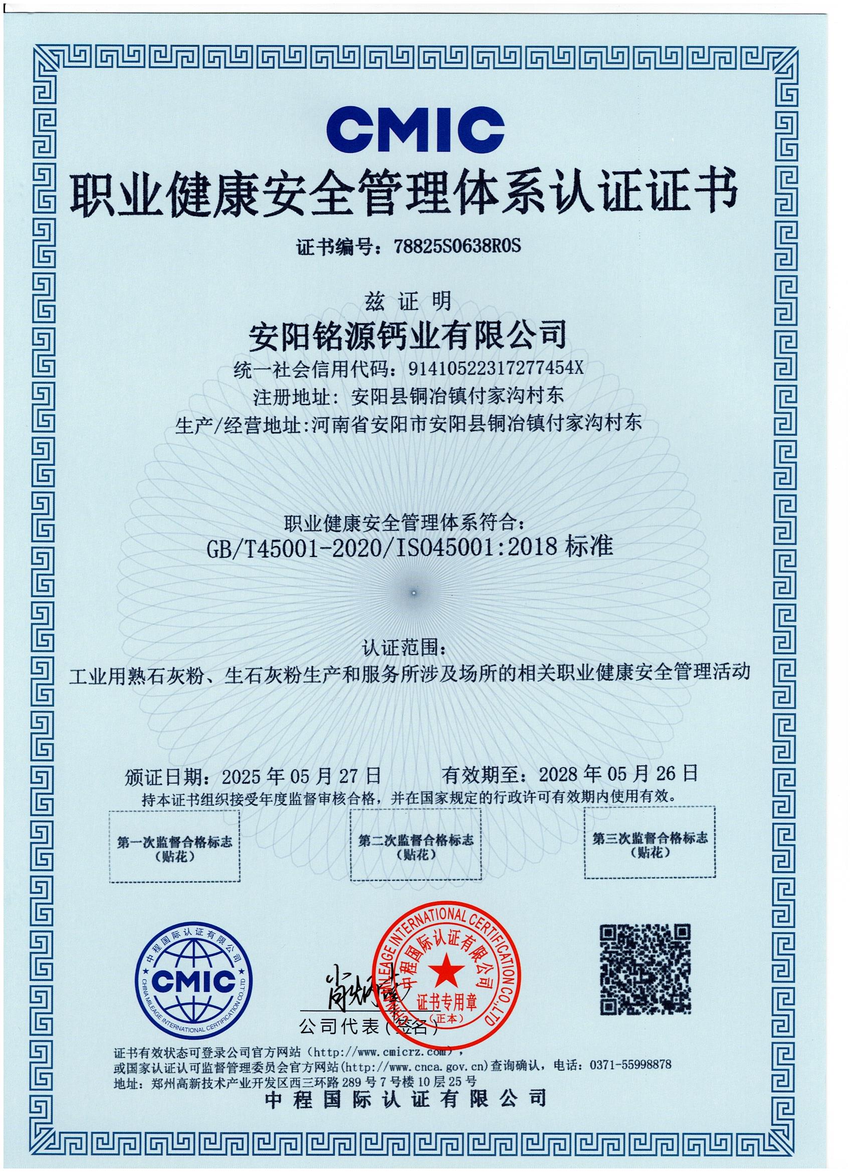 職業健康安全管理體系認證證書